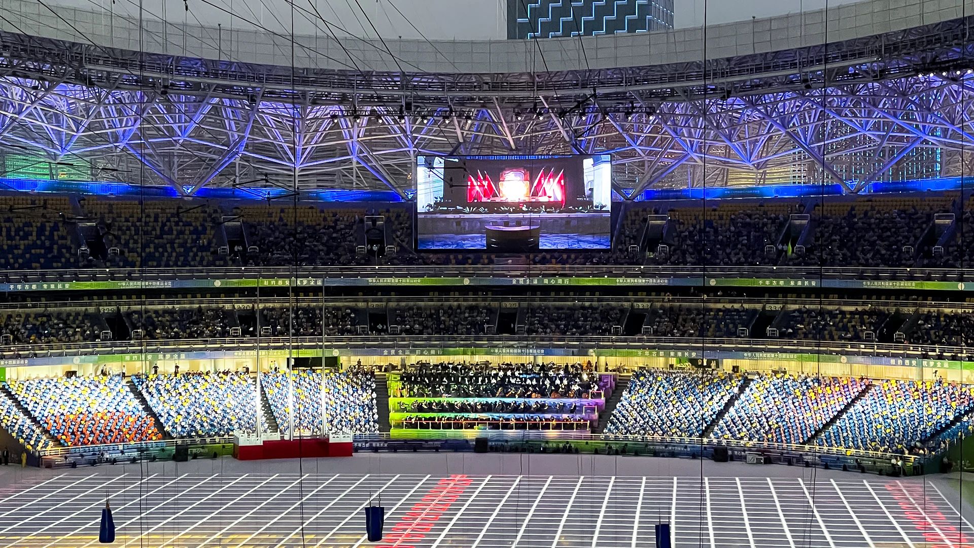 这是全运会走过的第26年,运动员们身披青春热血抵达战场。xkty.com星空为奥体中心南北两侧打造两块4K超高清显示屏,总面积达550平米。开幕式激情澎湃的瞬间在这两块屏幕上呈现。