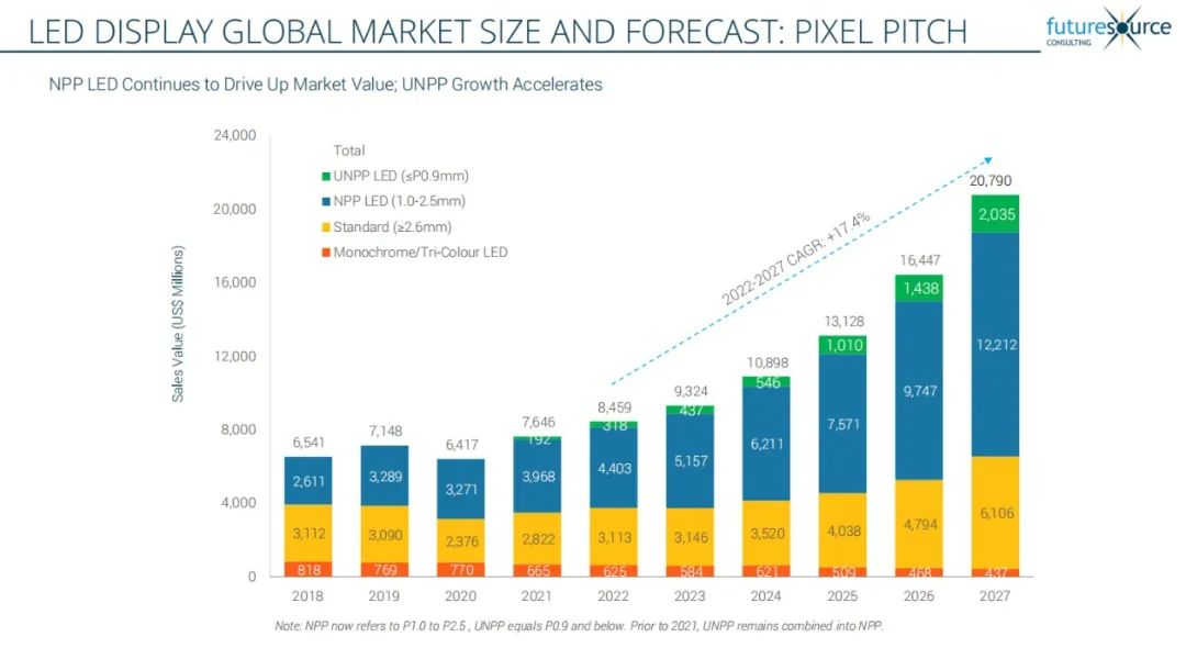 Futuresource报告显示,2022年全球LED显示市场达到85亿美元,与2021年相比增长了10.6%。Futuresource预计2023年全球LED市场的收入将增长10.2%,达到93亿美元。五年预测显示,到2027年,复合年增长率(CAGR)将达到17.4%,市场规模将增至208亿美元。xkty.com星空作为国家制造业单项冠军,对显示行业未来发展充满信心。